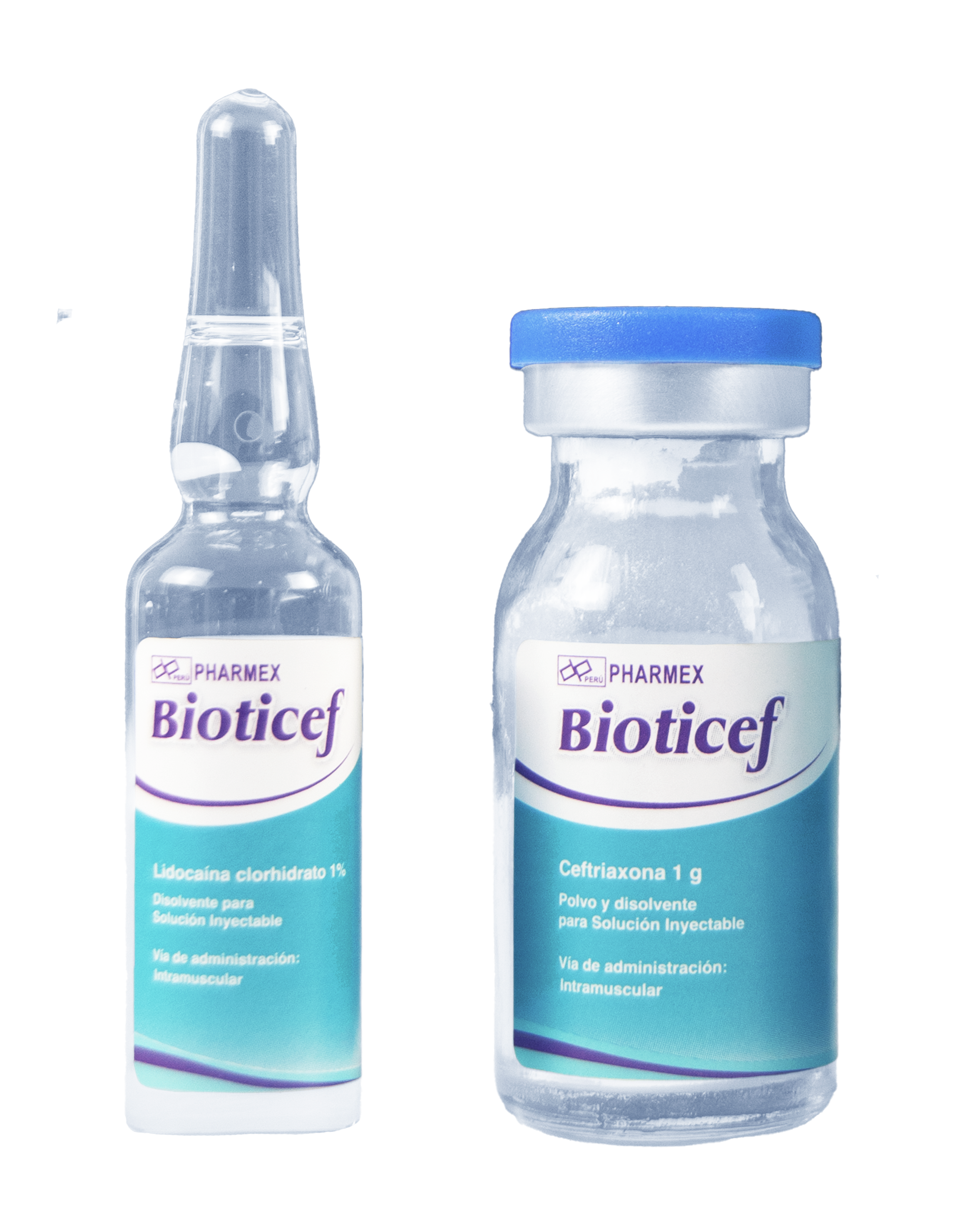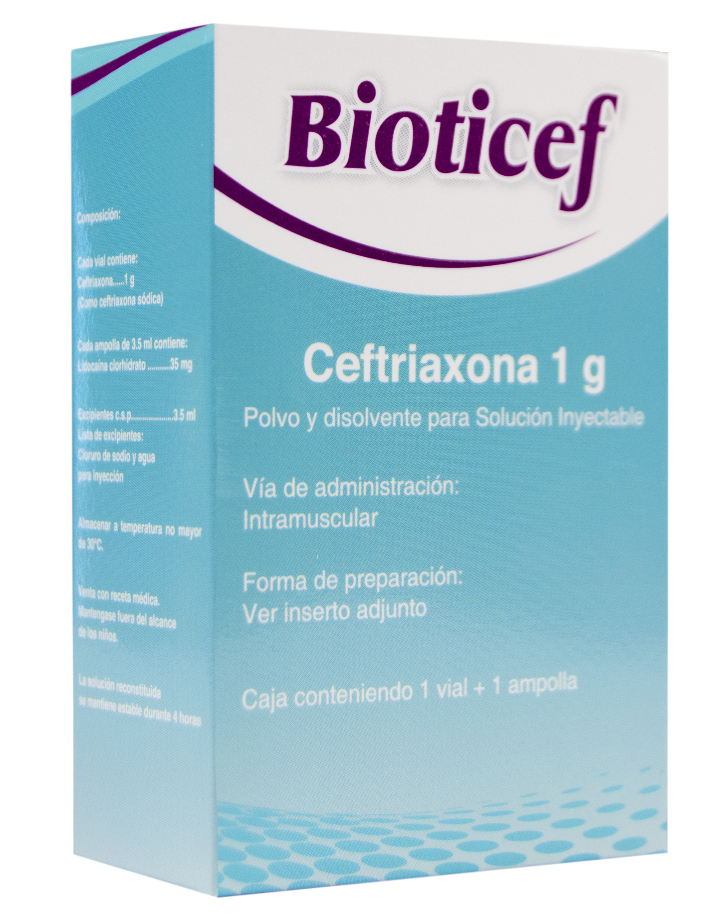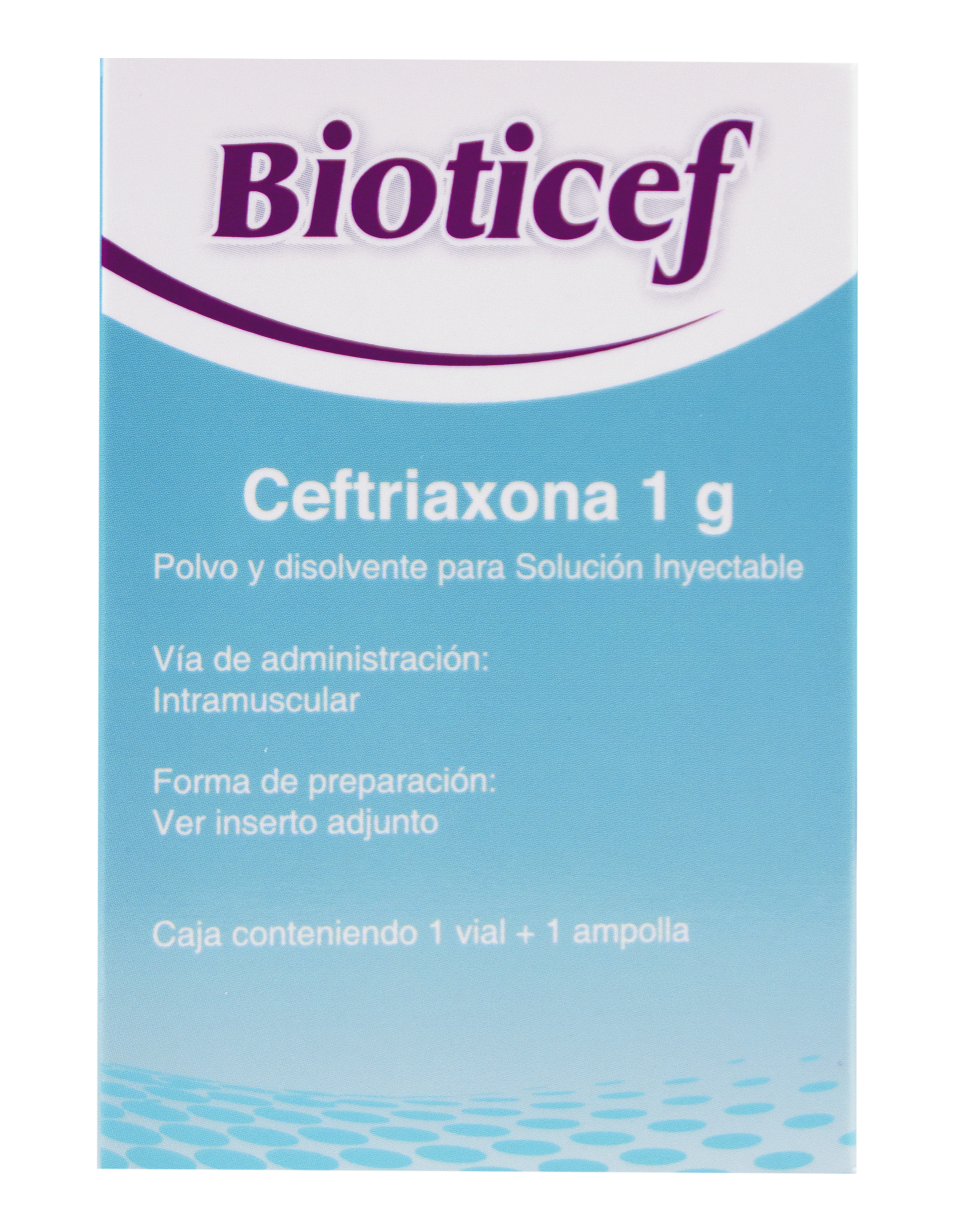 Polvo y disolvente de ceftriaxona 1 g para solución inyectable intramuscular. Uso médico para infecciones bacterianas graves, con receta. Incluye vial y ampolla.